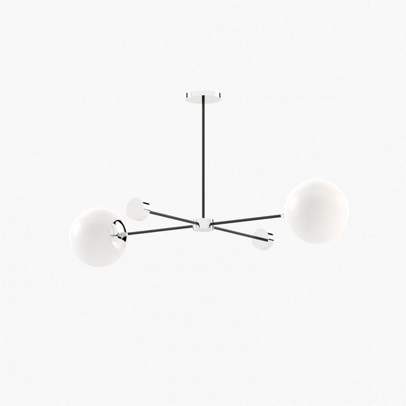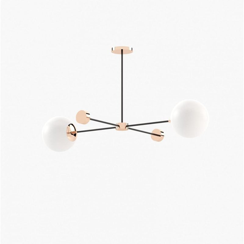 Janis suspension lamp is a contemporary light pendant that features stainless steel ceiling support. Inspired by the beauty of bubbles, it features two round white bulbs, pointing in different directions. A non-conventional pendant for modern mid-century decoration