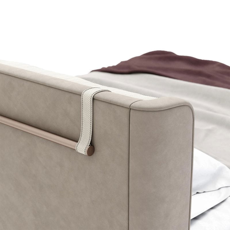 Kelsi is an outstanding design and handcraft work, combining unique production techniques and fine materials to create a rare piece. The wingback headboard is the focal point of this bed, rich in details. It features two large padded cushions for extreme comfort, supported by two lavish metallic tubes. Along with the structure, you can find other small details, the result of exclusive craftsmanship.