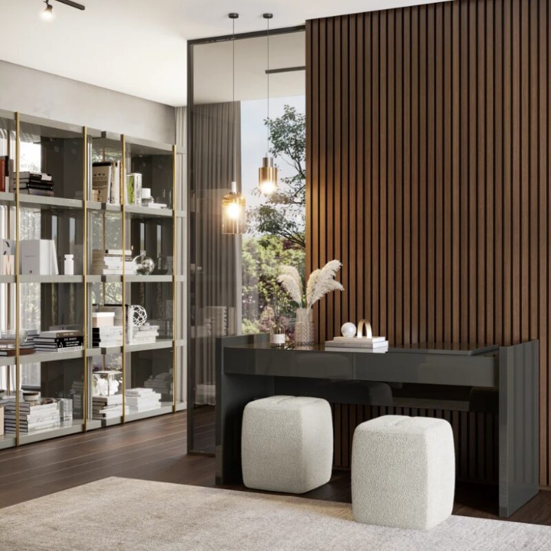 Η τουαλέτα υπνοδωματίου Erzou παρουσιάζει μια ισορροπία μεταξύ σχεδίασης και λειτουργικότητας. Η ανάλαφρη δομή της και οι κομψές αναλογίες της, την καθιστούν ιδανική για υπνοδωμάτια όπου τα έπιπλα ενσωματώνονται ήπια στον χώρο. Η μεγάλη επιφάνεια προσκαλεί για προσεκτική οργάνωση και δημιουργία προσωπικων στιγμών.
