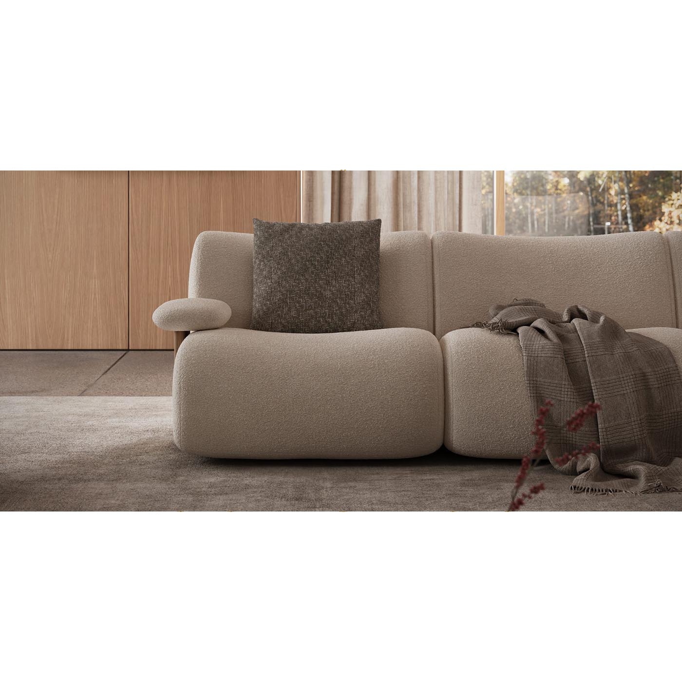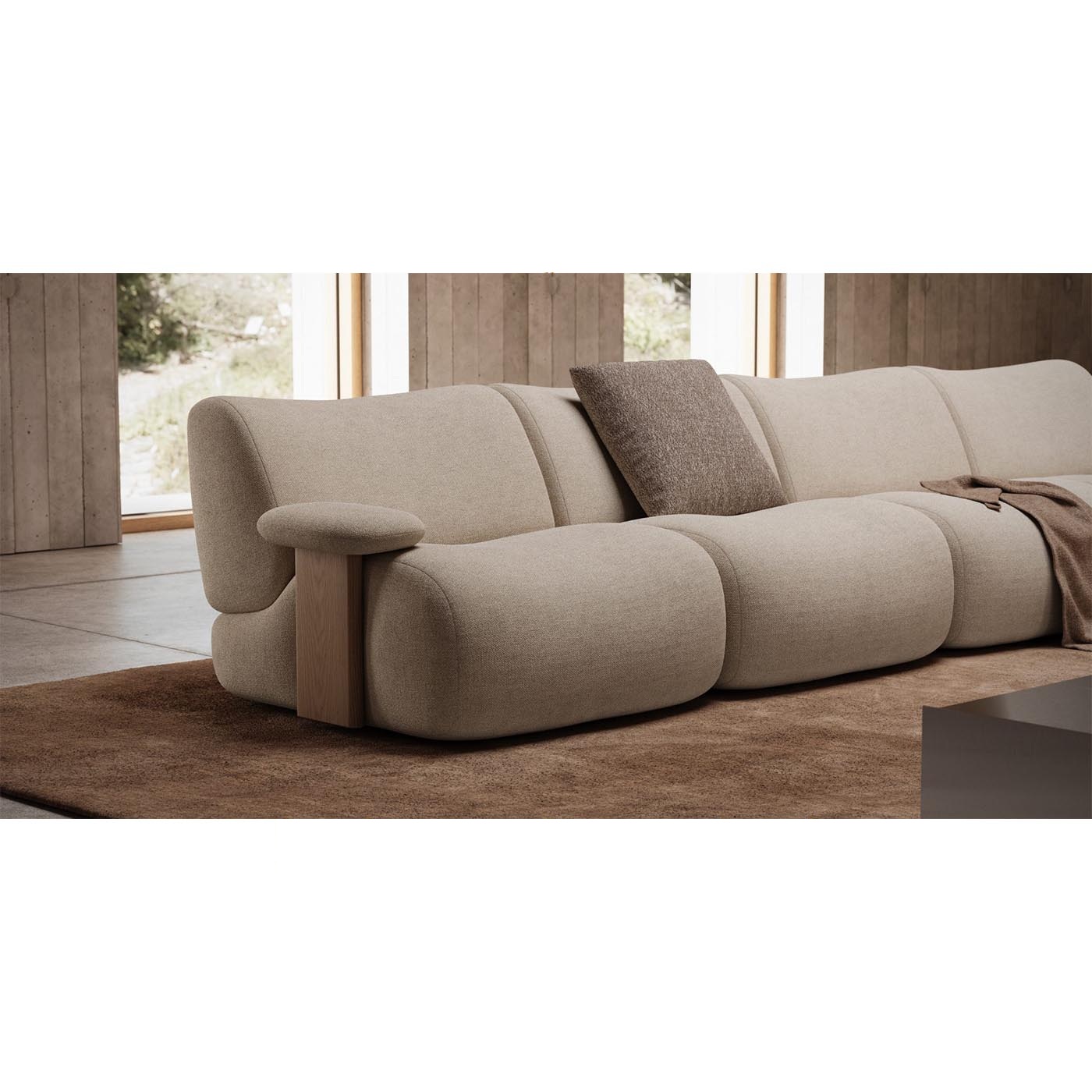 Μια εκλεπτυσμένη ξύλινη λεπτομέρεια στα μπράτσα προσθέτει έναν αρχιτεκτονικό χαρακτήρα και προσφέρει μεγαλύτερη ευελιξία στους συνδυασμούς υλικών και φινιρισμάτων, καθιστώντας τον καναπέ Giorgio ιδανική επιλογή για σύγχρονους χώρους διαβίωσης.