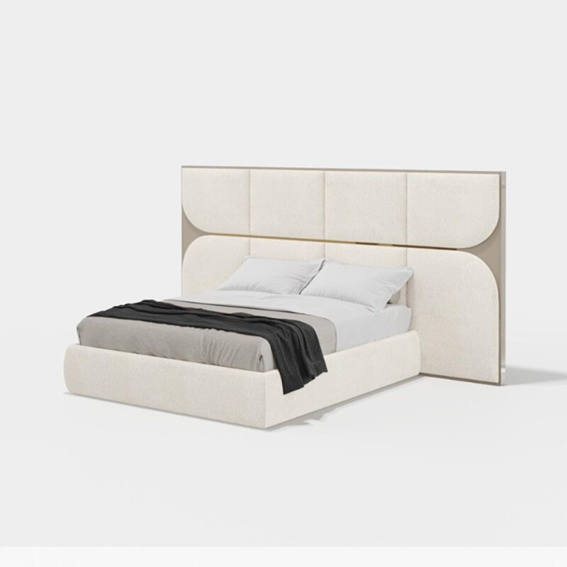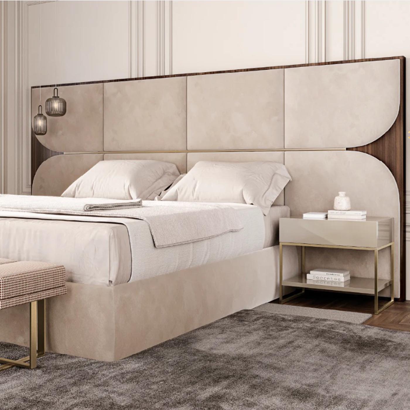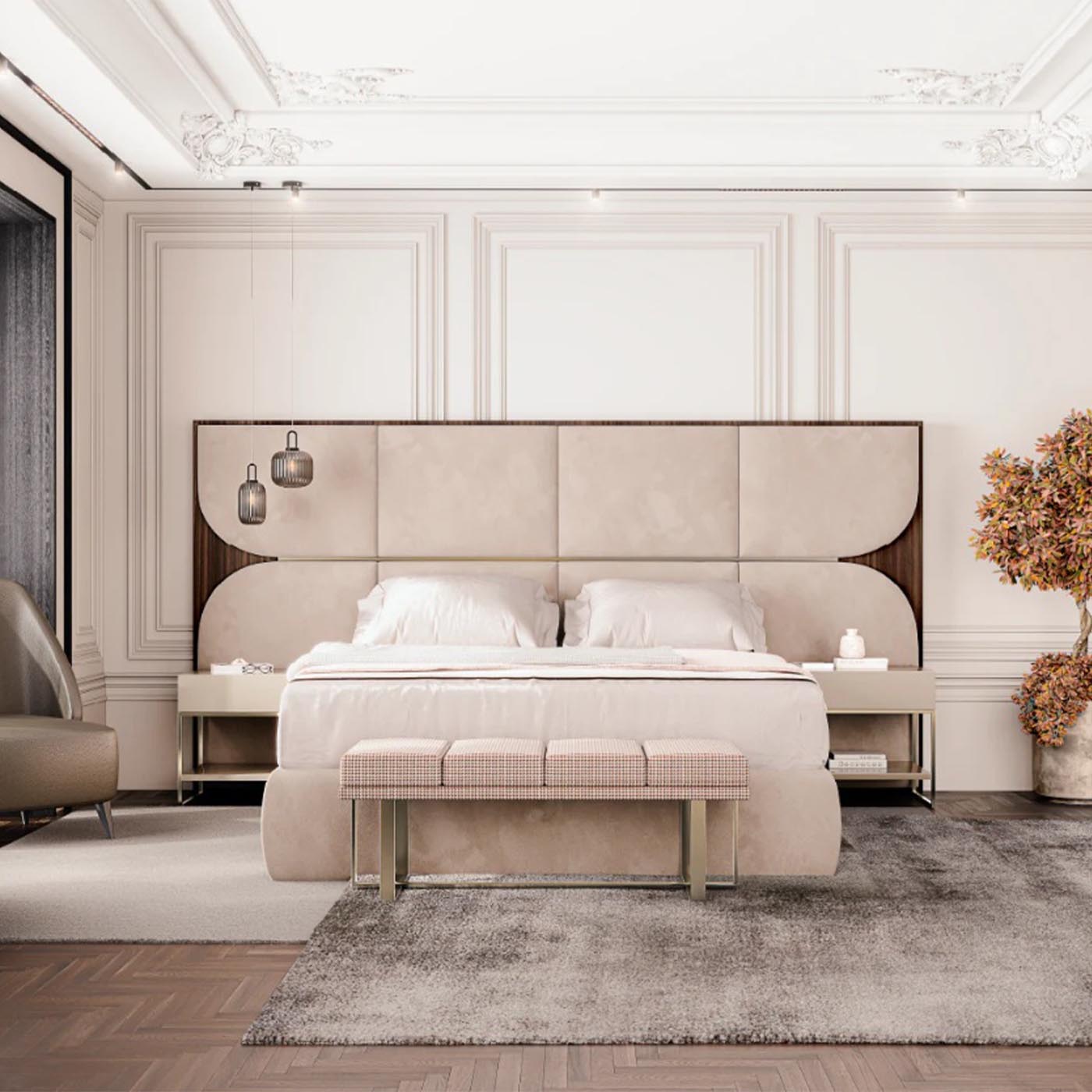 Το κρεβάτι Sakya διαθέτει έναν σχεδιασμό που συνδυάζει τη συμμετρία και την άνεση με μια καθαρή και εκφραστική οπτική ταυτότητα. Το επενδυμένο κεφαλάρι, με ευθείες γραμμές και φιλόξενο προφίλ, εκτείνεται πλευρικά με ελαφρότητα, δημιουργώντας ένα διακριτικό πλαίσιο που αναδεικνύει το σύνολο.